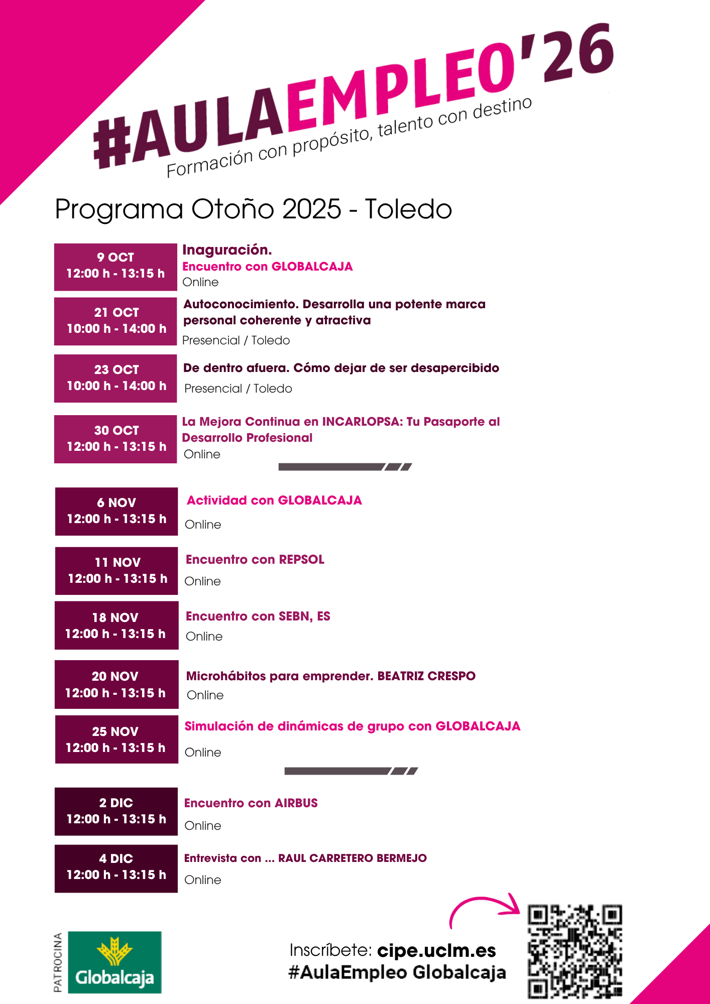 Todo el AULAEMPLEO se desarrollará de octubre a diciembre, comenzando el día 9 de octubre. Los talleres de 4 horas tendrán lugar dos días a la semana. En esta edición contamos con el patrocinio deGLOBALCAJAque nos acompañará en el programa con diferentes actividades y contaremos también con empresas de distintos sectores. También tendremos una charla especializada en emprendimiento con una experta en este sector, simulaciones de pruebas selectivas y una entrevista con un profesional que ha sido antiguo alumno de la UCLM.