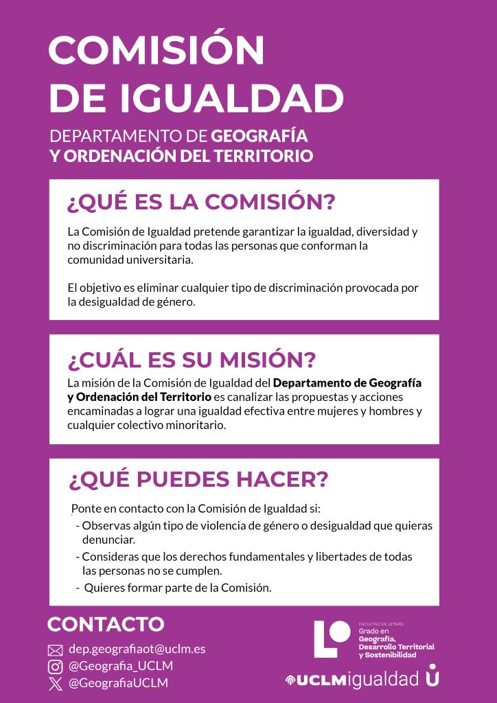 La Comisión de Igualdad de la UCLM tiene como finalidad promover la igualdad, la diversidad y la no discriminación de todas las personas que integran la comunidad universitaria. En este marco, la Comisión de Igualdad del Departamento de Geografía y Ordenación del Territorio busca canalizar propuestas y acciones orientadas a alcanzar una igualdad efectiva entre mujeres y hombres, así como entre los distintos colectivos minoritarios, fomentando un entorno libre de cualquier tipo de discriminación.