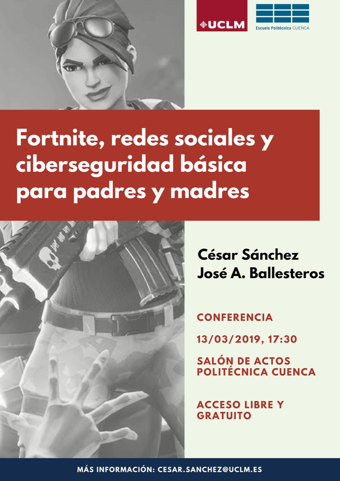 Este 13 de marzo a las 17:30 en el salón de actos de la Politécnica de Cuenca tendremos una charla de la mano de César Sánchez y José A. Ballesteros sobre “Fornite, redes sociales y ciberseguridad básica para padres y madres” en la cual podremos aprender todo lo necesario para la seguridad de nuestros pequeños y no tan pequeños de la casa.