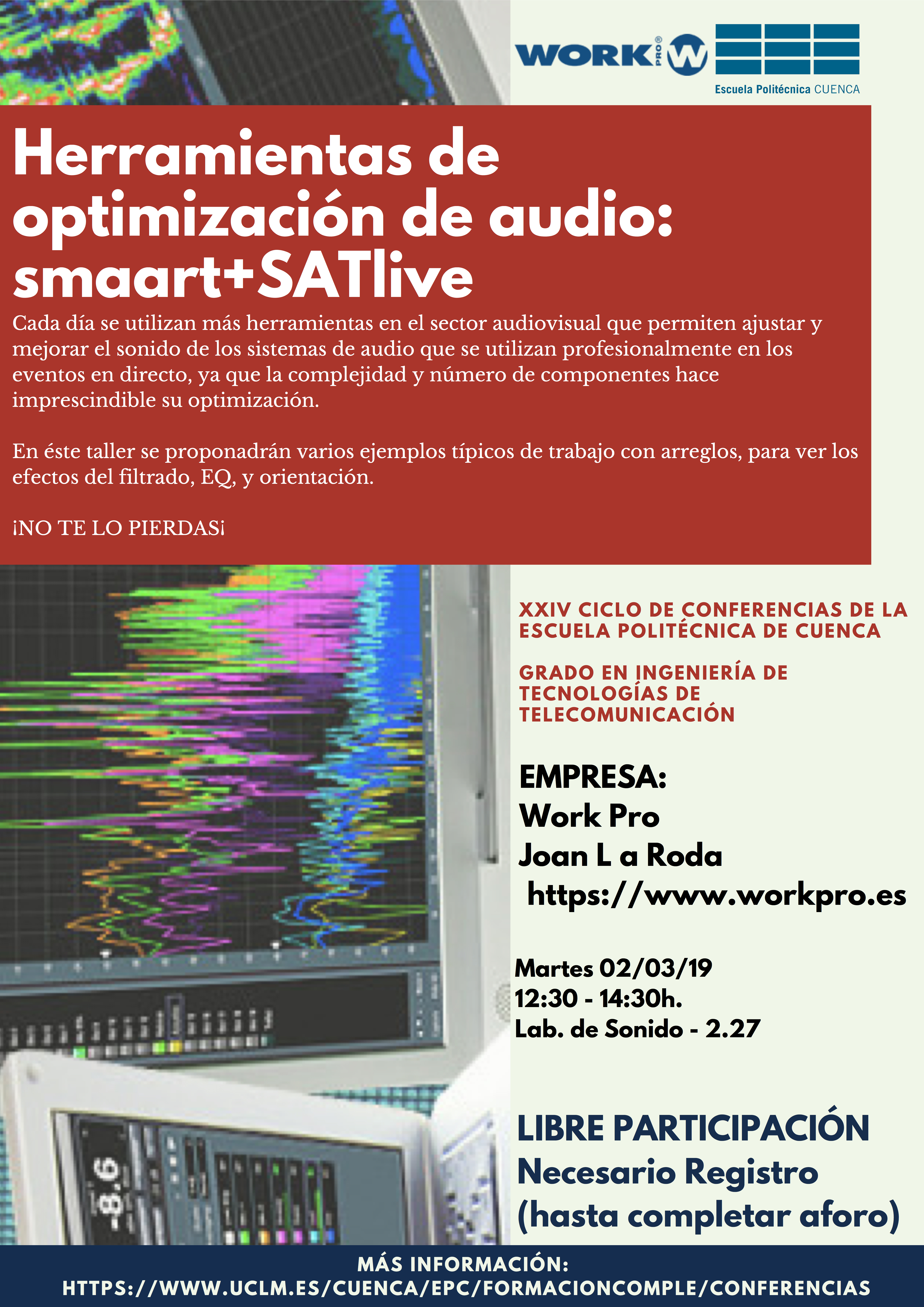 El próximo martes 02/03/19 en el XXIV Ciclo de conferencias de la Escuela Politécnica de Cuenca tendremos un taller de “Herramientas de Optimización de audio: SMAART y SATlive” donde se verán distintos casos prácticos más comunes en eventos en directo y como ajustar los equipos con la ayuda de estas magnificas herramientas de calibración.