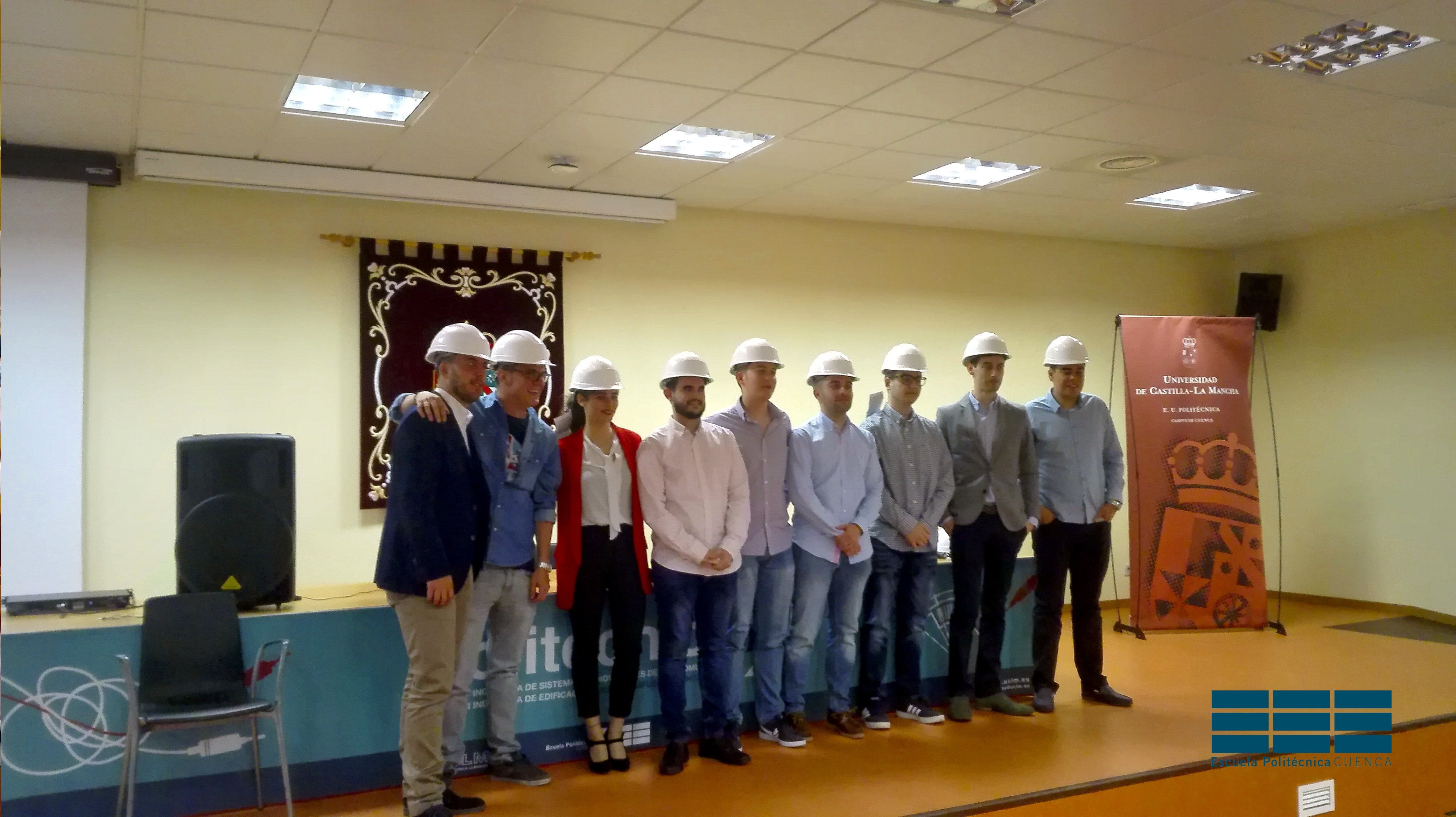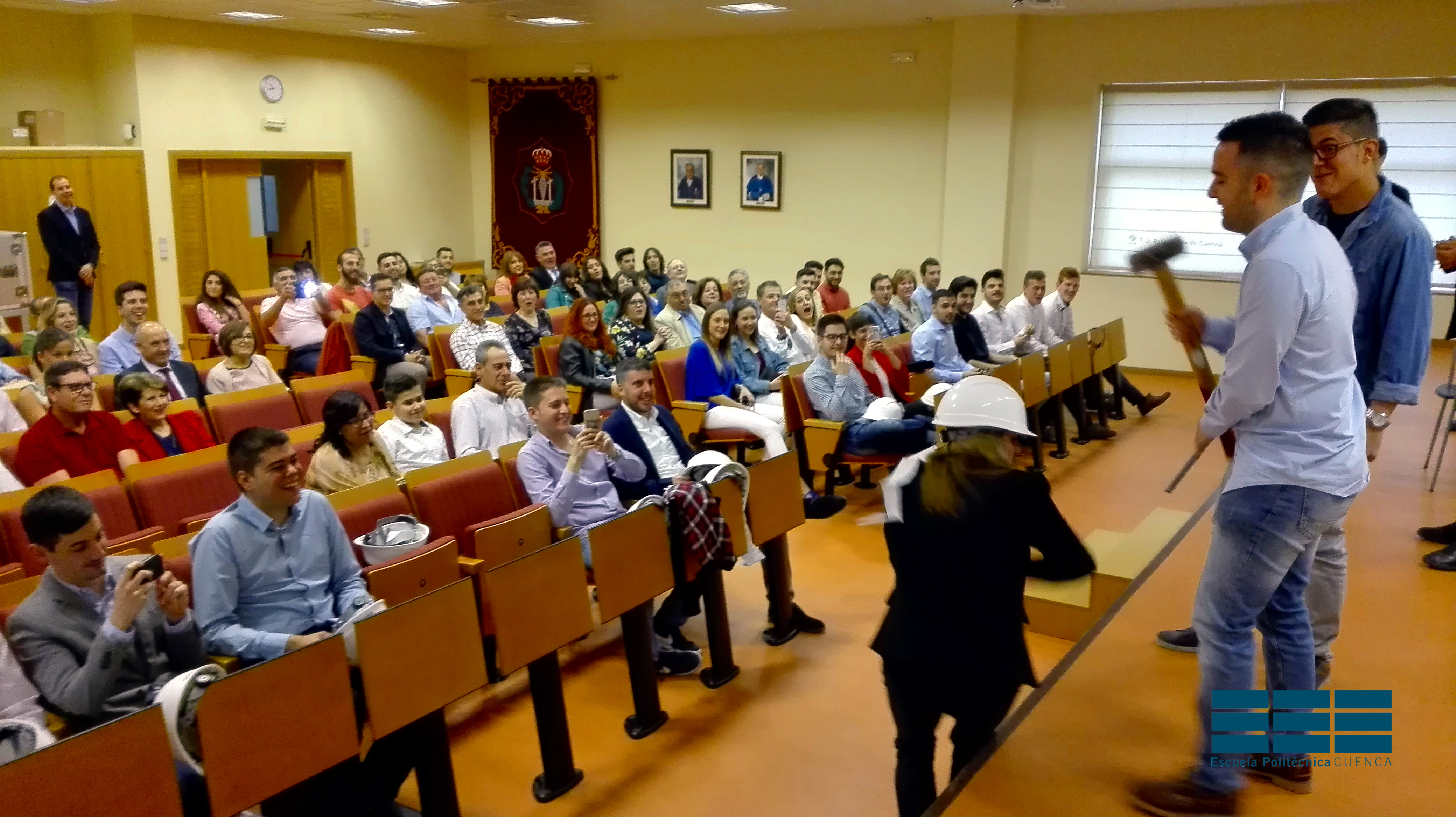 El pasado sábado, 9 de junio, tuvo lugar la tradicional "imposición de cascos" a la promoción 2014/15 de Ingeniería de Edificación e Ingeniería de Tecnologías de Telecomunicación. El acto se llevó a cabo en el propio Salón de Actos de la Escuela Politécnica de Cuenca y a él asistieron numerosos familiares y amigos, que quisieron acompañar a los alumnos en este inolvidable momento.