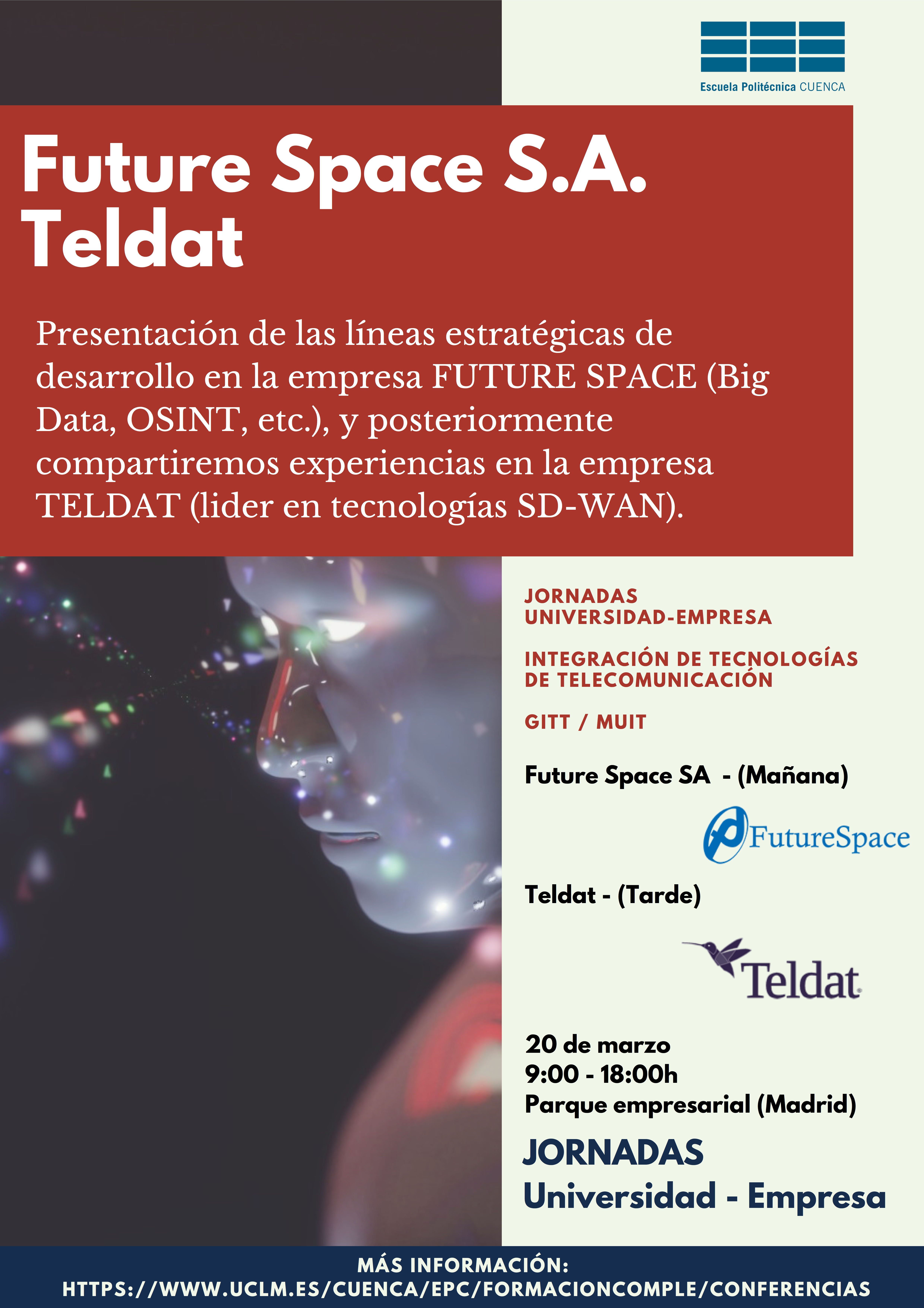 ¡Vuelven las Jornadas Universidad-Empresa! Esta vez contaremos con el privilegio de conocer FUTURE SPACE SA (Big Data, OSINT,etc) y TELDAT (líder en tecnologías SD-WAN) en el Parque Empresarial en Madrid