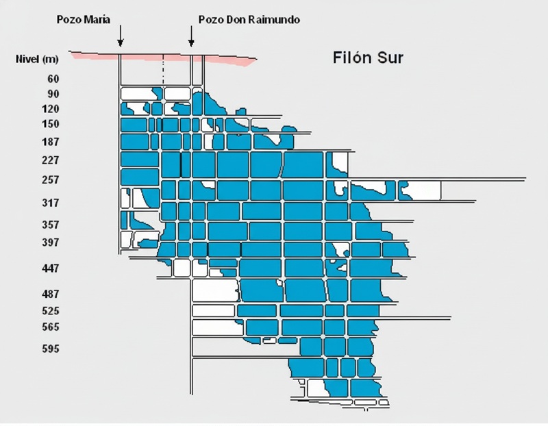 Esquema de las labores sobre el filón Sur, explotado mediante los pozos María y Don Raimundo