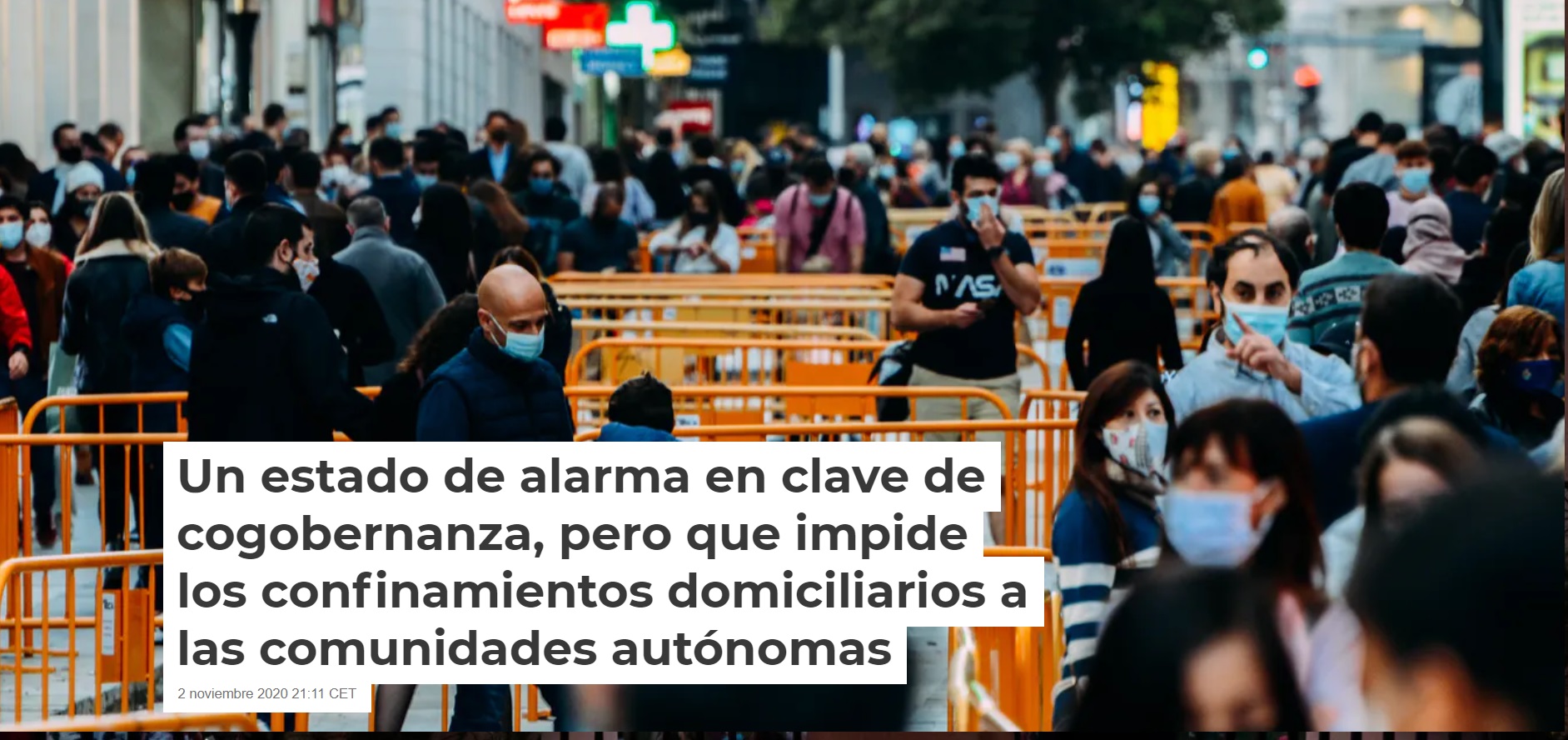 Con el Real Decreto 926/2020, de 25 de octubre se ha dado un importante paso más, que se sale de estos esquemas y que es altamente preocupante. Se ha gestado directamente con vocación de permanencia (en principio, seis meses) y con voluntad de responder también a un esquema de “cogobernanza”, cuando esta fórmula ni existe en el ordenamiento jurídico ni ahora “toca”, si se me permite esta expresión. Incluir la cuestión competencial de un modo tan intenso y extenso en el contenido del estado de alarma provoca importantes disfunciones.