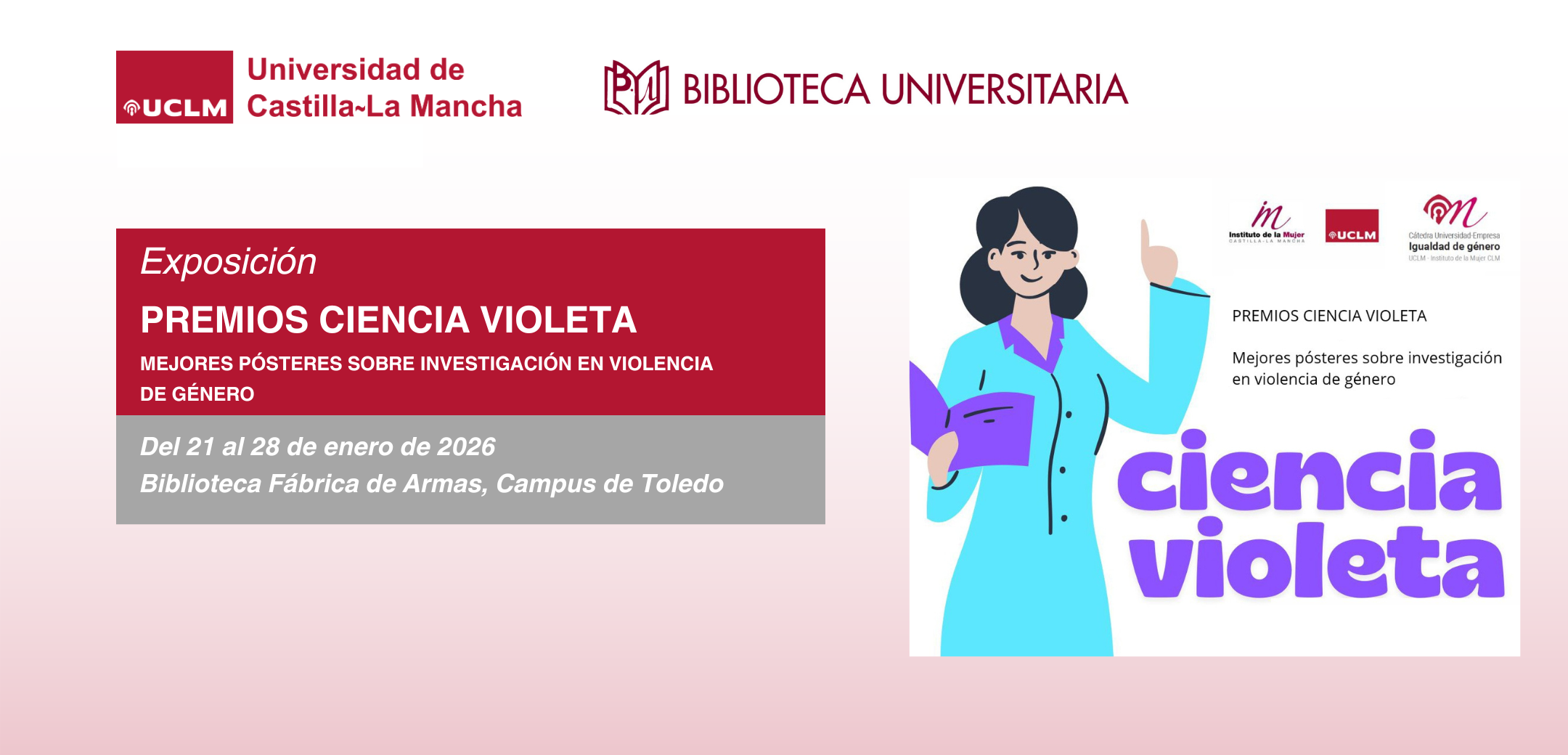 La Biblioteca de la Fábrica de Armas, en el Campus de Toledo, acoge, del 21 al 28 de enero, la exposición de los tres carteles ganadores del concurso Ciencia Violeta, una iniciativa de la Cátedra de Igualdad de Género de la UCLM que impulsa la investigación en violencia de género y la igualdad entre mujeres y hombres en el ámbito universitario.