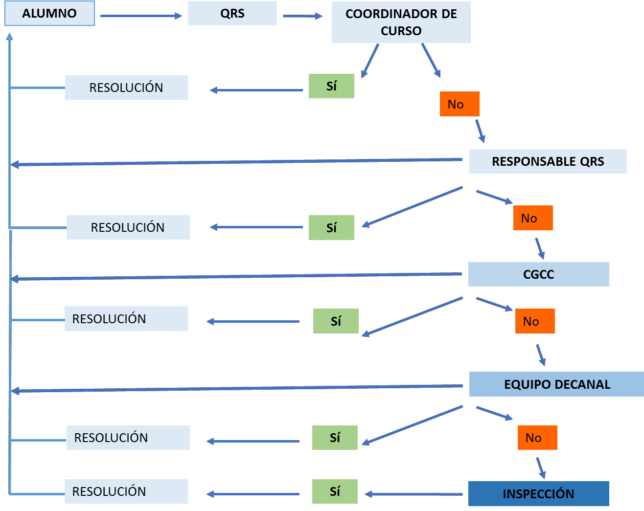 * En caso de que el profesor implicado fuese al mismo tiempo el coordinador de curso, el alumno trasladará la queja, reclamación o sugerencia QRS al coordinador de titulación.